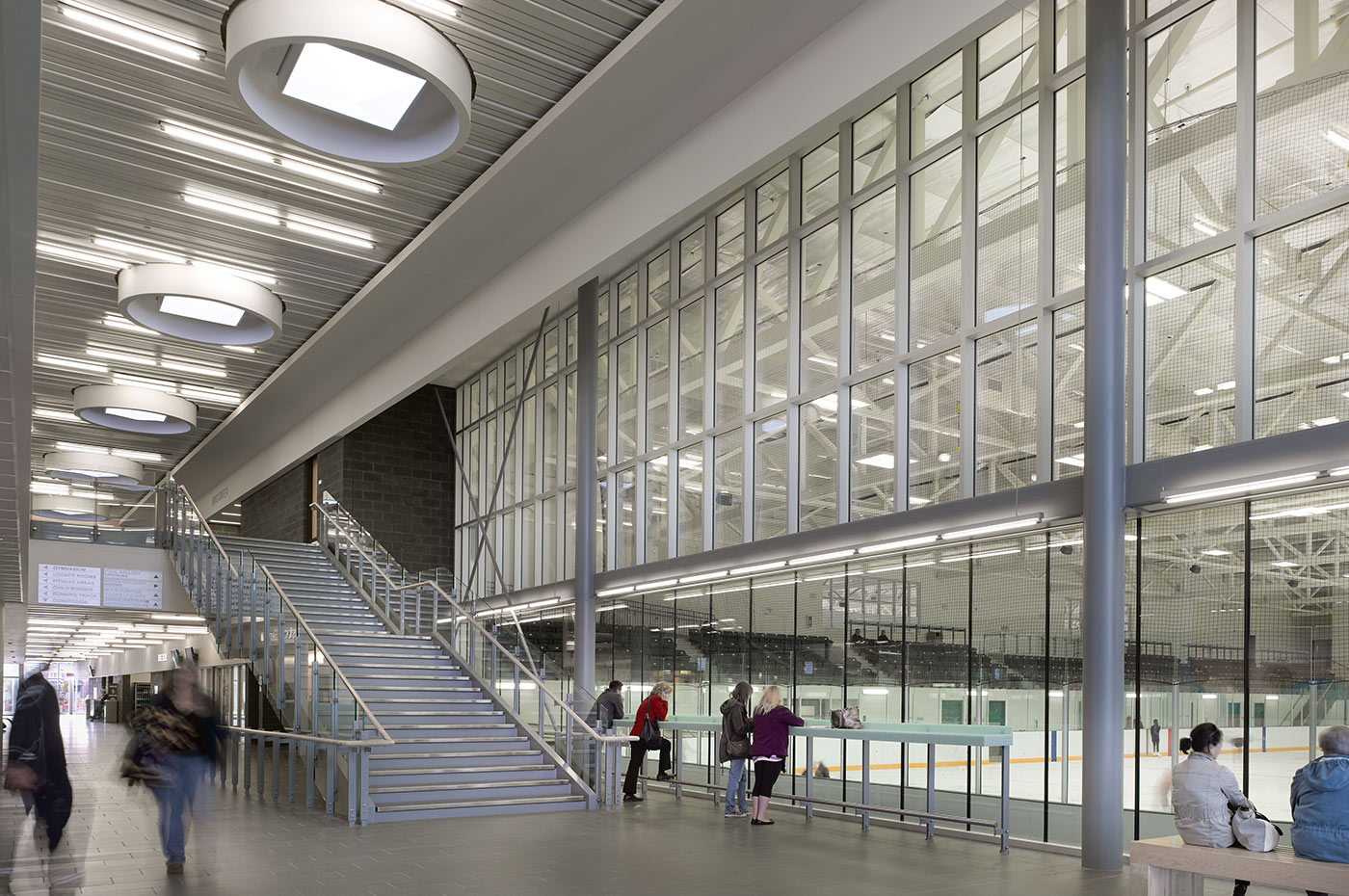 Visioning sessions with the Town of Bradford West Gwillimbury and open night sessions for community input, drove the best fit facility features for the Bradford Leisure Centre. The interior program consists of four major components: an NHL-sized twin pad facility with seating for up to 900 people, a pool complex, a double gymnasium with a walking/running track, and community service spaces.