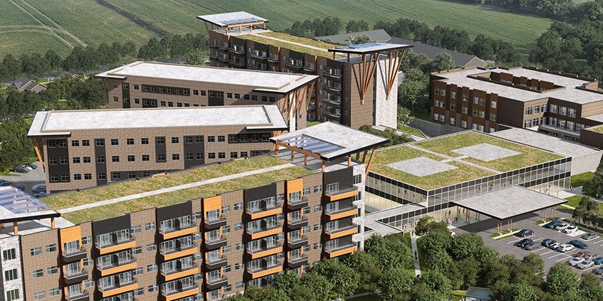 This 440,000 sq. ft. development consists of a Community Health Hub, a Long-Term Care Facility, Affordable Housing, Supportive Housing, Retirement Suites, Life Lease Suites, Market Rental Suites, Garden Homes, Townhomes, and Co-Housing for a total of 337 units. The major programs are located in 5 residential low-rise towers with the Garden Homes, Townhomes and Co-Hosing being separate from the main facility.